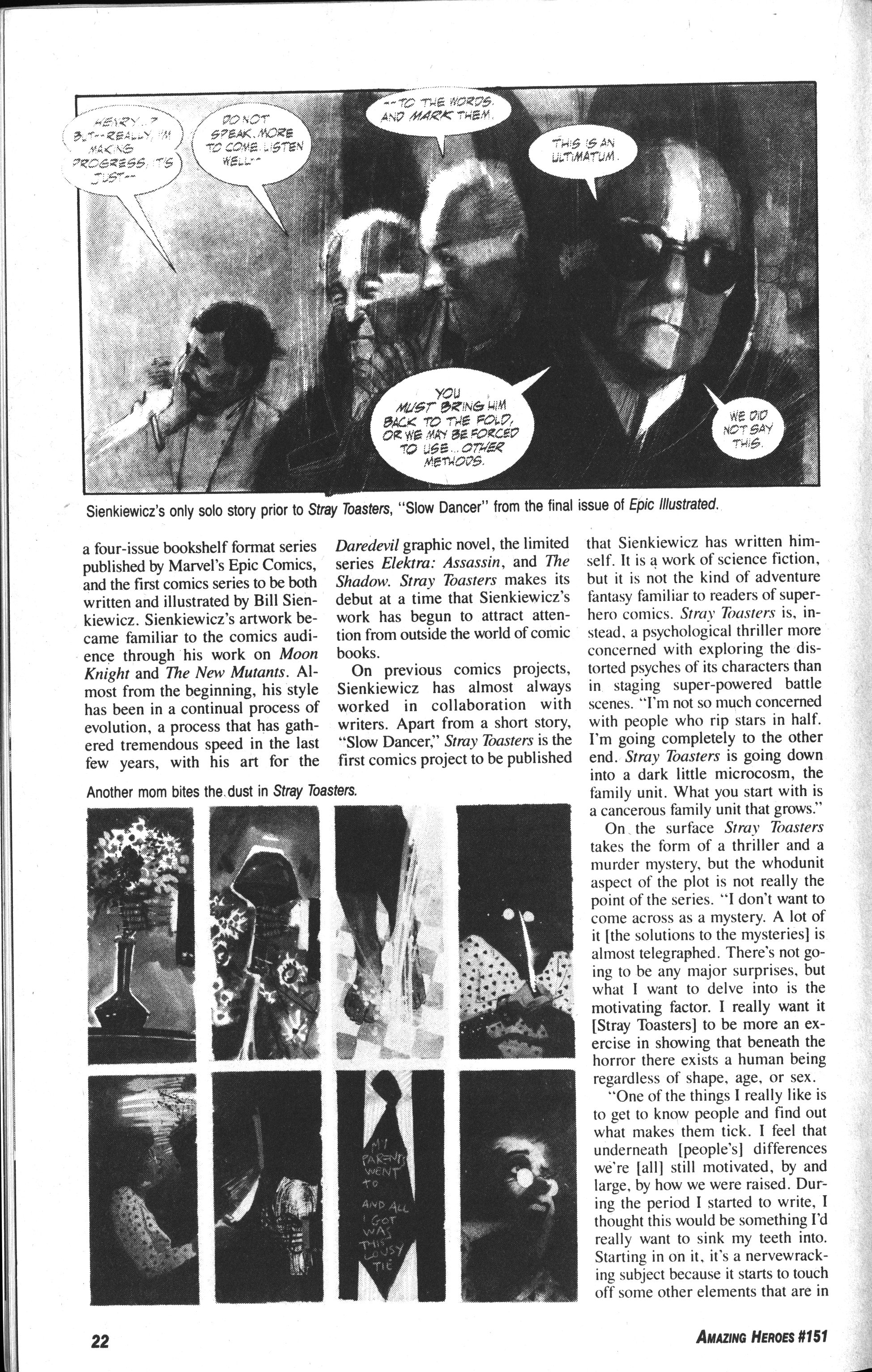 So… did Sienkiewicz put everything he had into this one story (about families, I guess), and then wanted to go back to just doing artwork? It’s really weird: I can’t think of anybody in his position who’s done that. I mean, after doing one highly artistically successful long work like this, completely going back to illustrating other people’s stories.